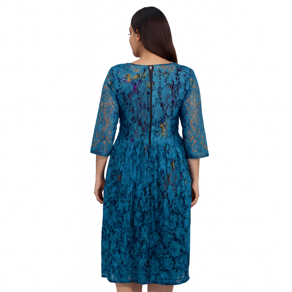 A blue lace overlay dress with three quarter length sleeves and a floral design. The lace is semi-transparent, allowing the inner layer to show through. A vibrant patterned fabric featuring bold circular designs in pink, yellow, and turquoise on a black and teal background. The inner layer revealing the colorful inner layer beneath. This adds a dynamic touch and highlights the layered design. The dress falls to knee-length with a slightly flared skirt, creating an elegant and flowing shape.