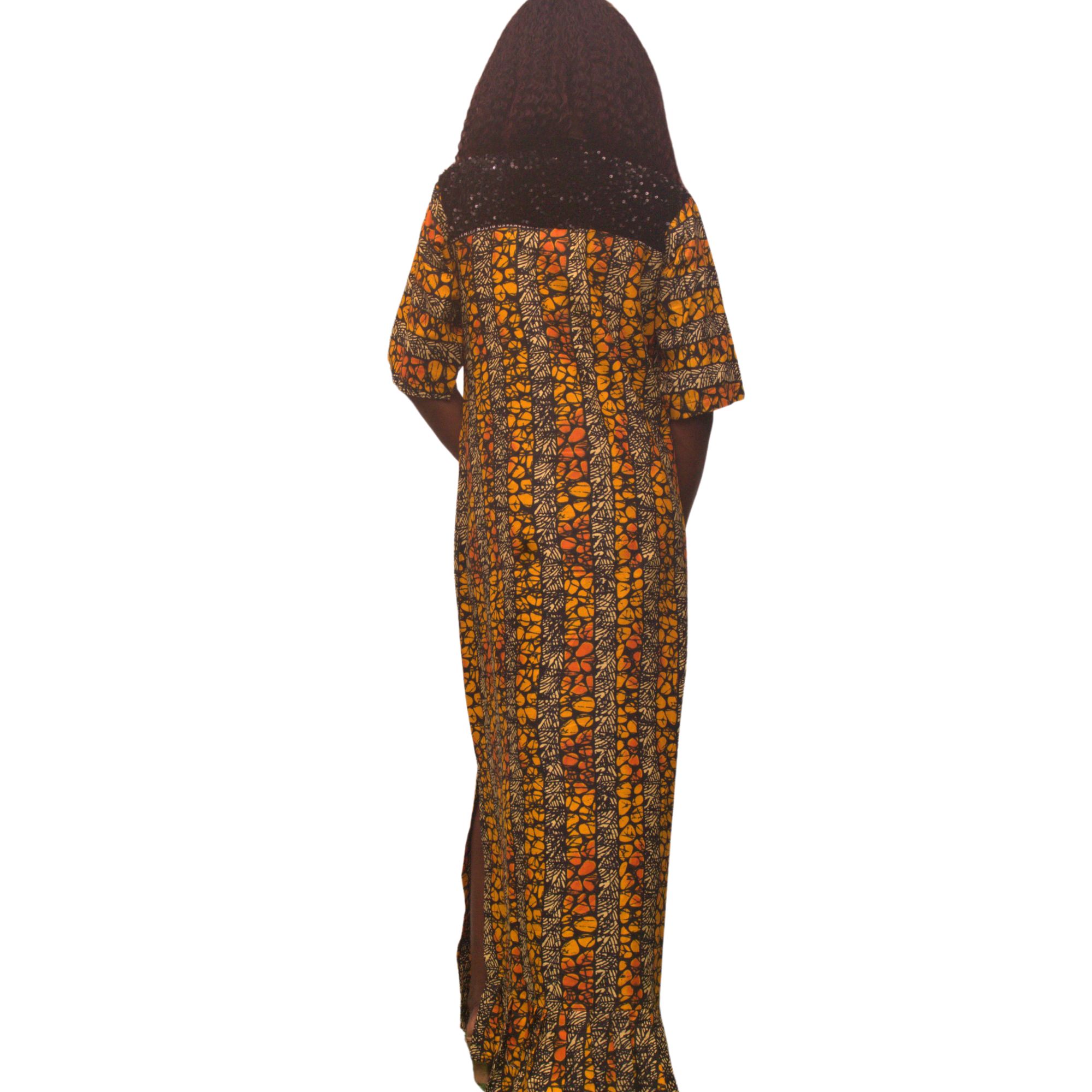 This dress is a traditional African dress adorned with an intricate Ankara print in warm colors of orange, yellow, and black.
