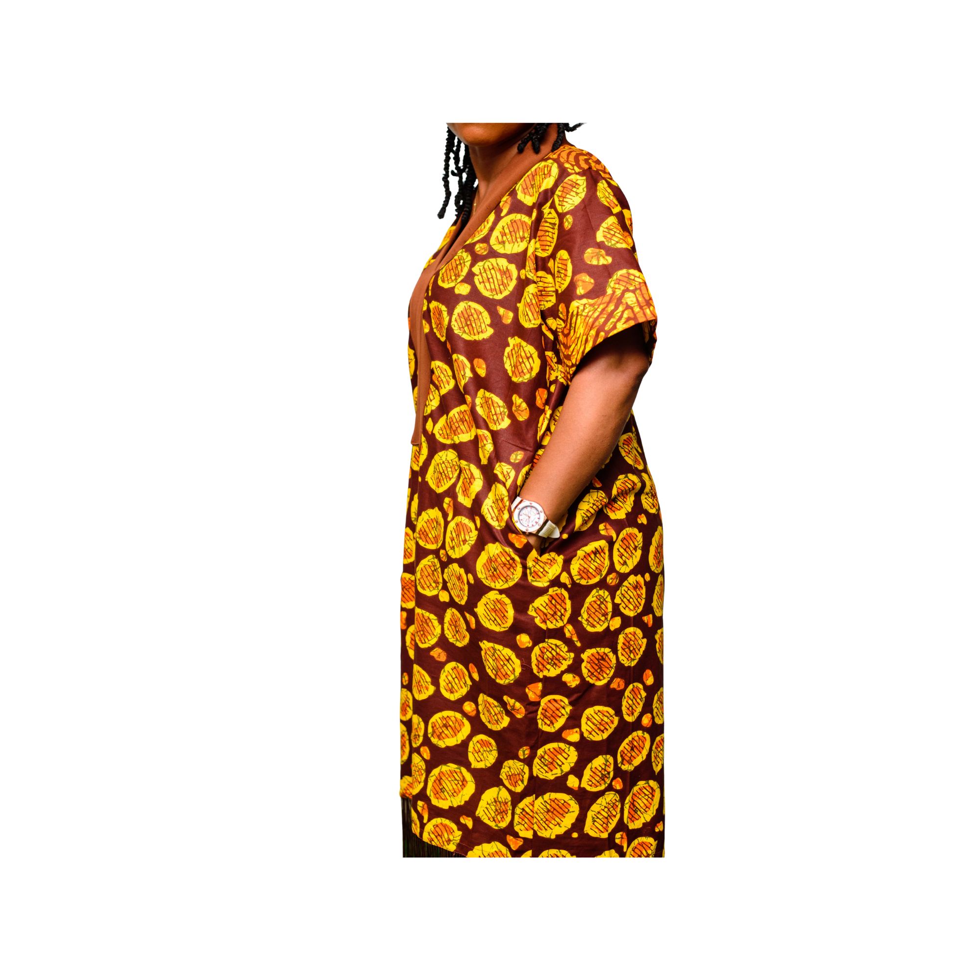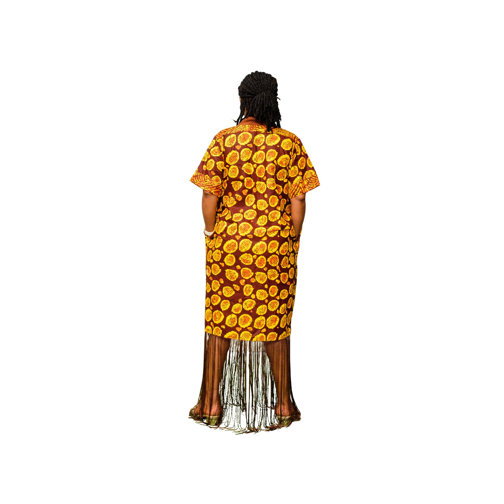 The dress is knee-length with short sleeves and a V-shaped neckline, made from a bold yellow and orange circular pattern on a brown background. It features a solid brown neckline and long brown fringe at the hem that extends to the ankles, blending vibrant design with elegant movement.