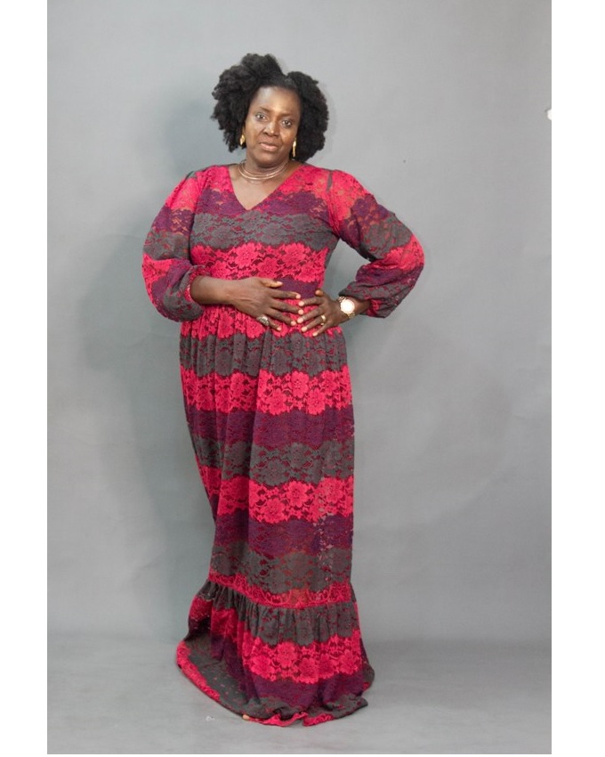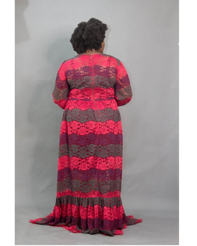 This striking full-length gown features alternating horizontal bands of rich pink and deep purple lace, creating a bold yet sophisticated visual rhythm. The intricate lacework adds texture and depth, while the fitted waist and long sleeves enhance the silhouette with graceful structure. The flowing flair cascades effortlessly, balancing traditional craftsmanship with contemporary flair. Perfect for formal occasions, this dress exudes confidence, elegance, and artistic charm.