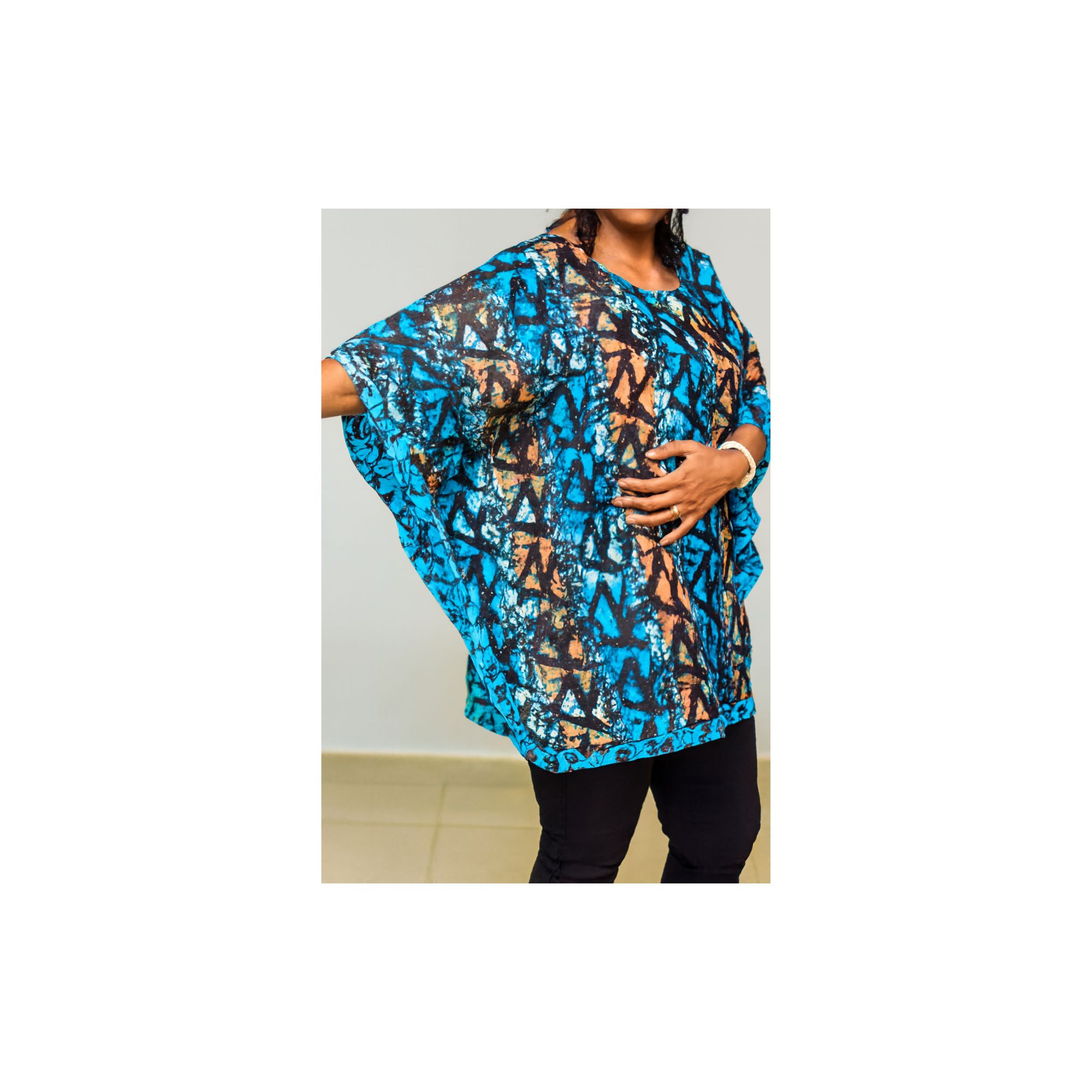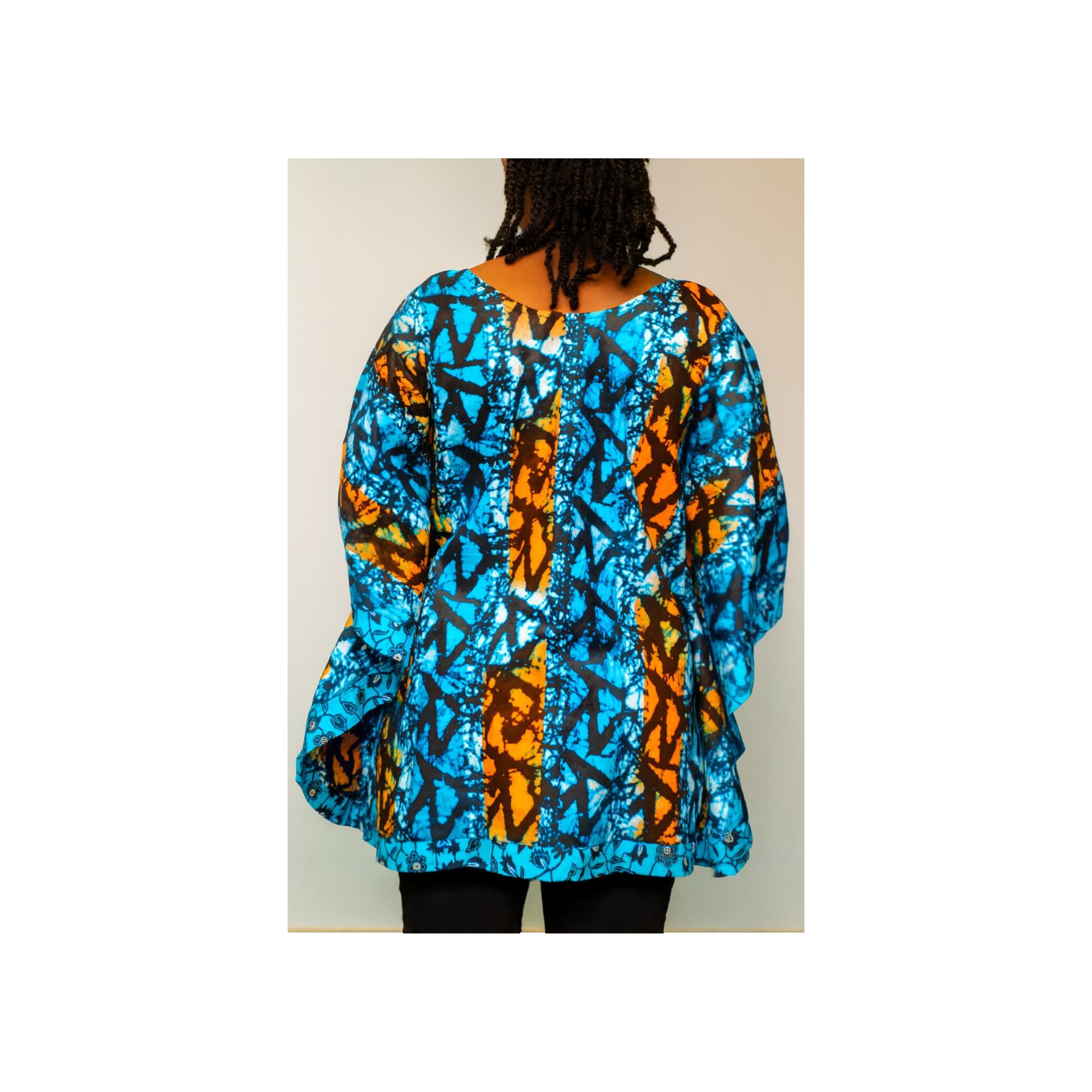 This is a vibrant traditional African garment, styled in a loose-fitting top with wide sleeves. The fabric showcases a striking mix of blue, black, orange, and white in abstract and geometric patterns, creating a dynamic and culturally rich visual. The edges of the sleeves and hem are bordered with a lighter blue band adorned with intricate floral and geometric motifs in black, adding contrast and elegance to the overall design.
