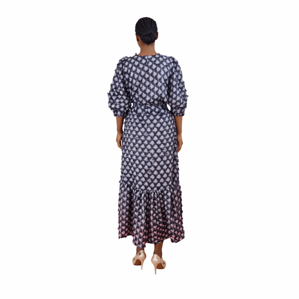 This cloth is a long, patterned dress with a repeating geometric or heart-like motif in contrasting dark and light shades. It features voluminous three-quarter sleeves, a fitted bodice, and a flared hemline that reaches near the ankles. The overall design gives it an elegant, flowing silhouette, perfect for formal or semi-formal occasions. The body of the dress is embellished with stones, giving it a shimmering, textured effect that enhances the geometric design. These stones catch the light, making the dress appear more luxurious and eye‑catching.