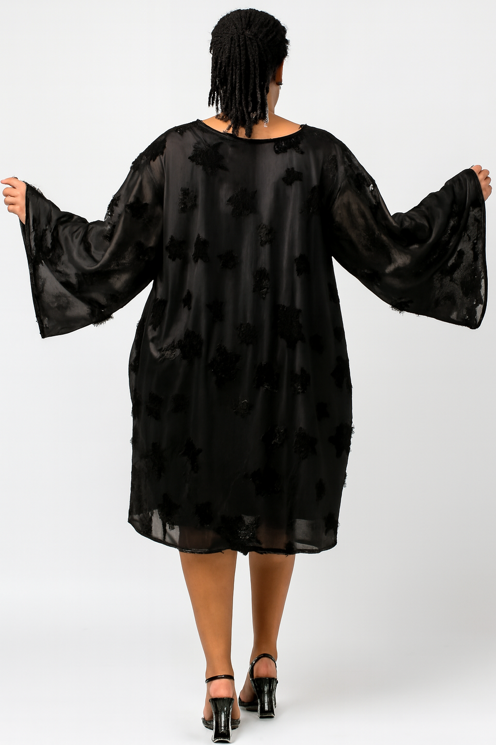 A knee-length black dress with oversized silhouette, round neckline, and long wide sleeves. The fabric is semi-sheer with textured, star-shaped floral appliqués scattered across it, slightly frayed for added dimension.
