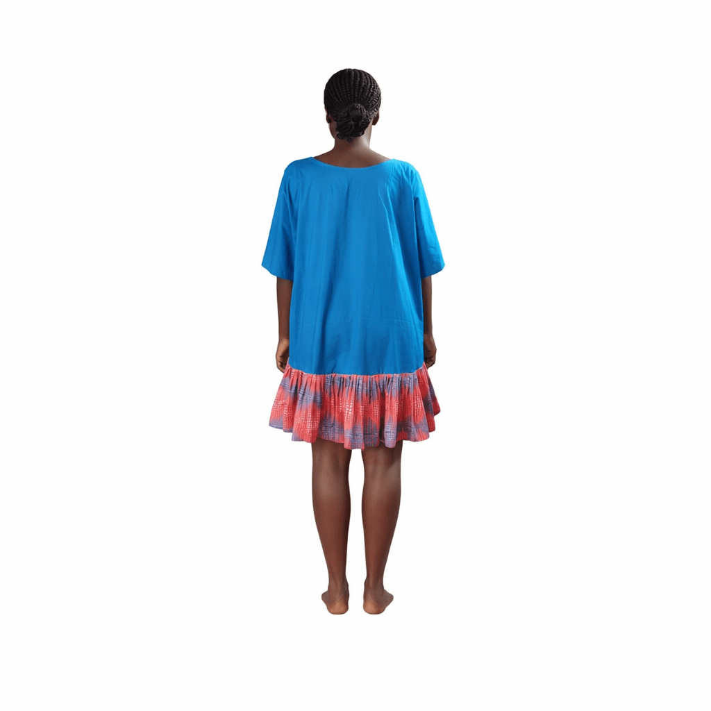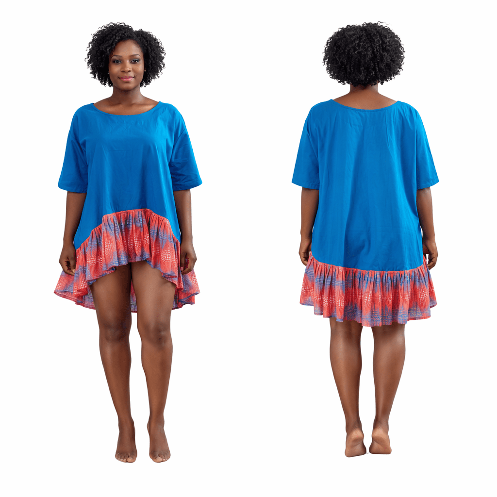 This cloth  is a bright blue dress with a relaxed, loose fit. It has short sleeves and a ruffled hemline that adds movement and flair. The standout feature is the colorful patterned ruffle at the bottom, showcasing shades of red, orange, and purple, which creates a striking contrast against the solid blue upper portion. The hemline is high-low style—shorter in the front and longer at the back—giving it a modern, stylish silhouette.