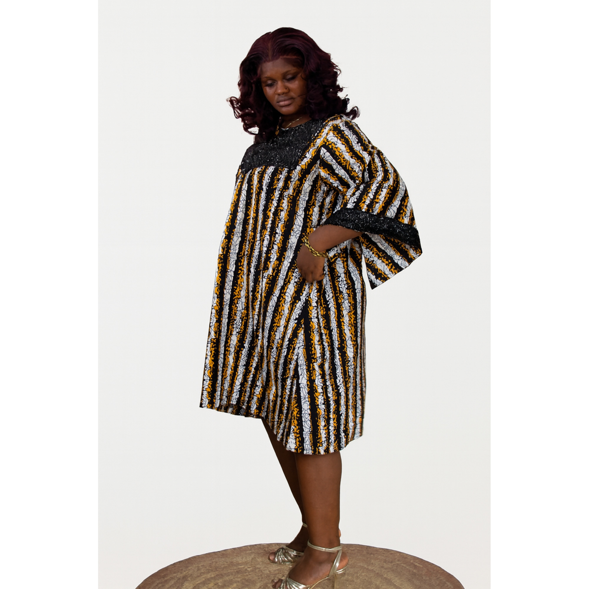 This garment is a sophisticated blend of bold patterns and shimmering textures, featuring a design that balances traditional African aesthetics with a modern silhouette. This is a knee-length, relaxed-fit shift dress, often categorized as a short kaftan or “Bubu” style. The dress features flared, elbow-length sleeves that add volume and a graceful flow to the outfit. The primary fabric is a vibrant African wax print or batik, featuring vertical “distressed” stripes in a striking color palette of mustard yellow, black, and white. The chest yoke and the cuffs of the sleeves are crafted from a contrasting shimmering black fabric. Upon closer inspection, these areas are heavily embellished with fine black beadwork, which adds a luxurious, three-dimensional texture and reflects light beautifully.